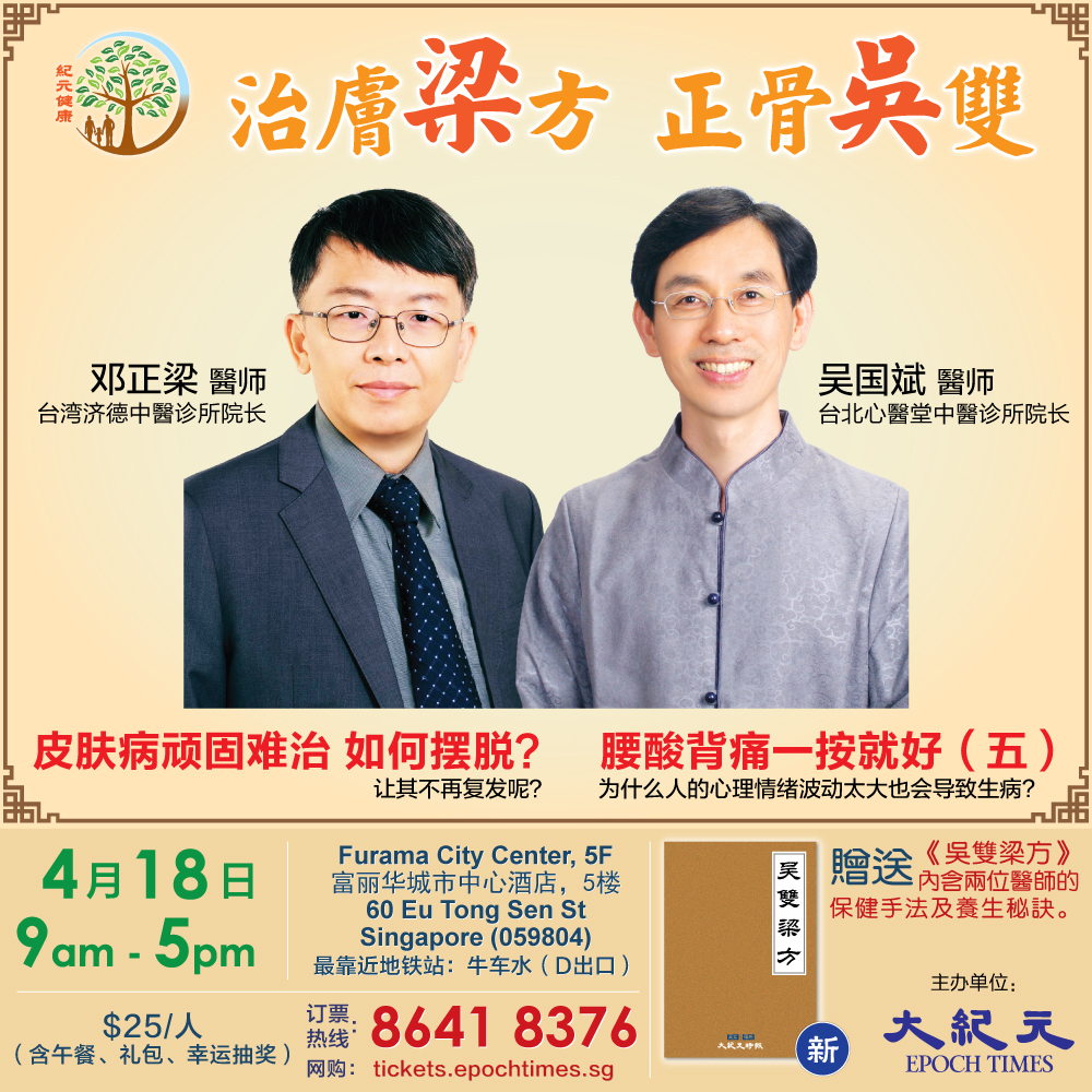 颈肩痛,还是腰背痛?三叉神经痛,还是坐骨神经痛?在本地颇受欢迎的台湾心医堂中医诊所院长吴国斌将再次莅临狮城,第五次分享“腰酸背痛 一按就好”的课题,教你简单而有效,就能做好颈椎和腰椎的DIY自我保健。 传统中医认为,人之所以生病,与人的精神状态息息相关,所以才有“内伤七情”的说法。吴医师将用一些实例说明,为什么人的心理情绪波动太大也会导致生病,以及什么才是真正延年益寿的养生秘诀。